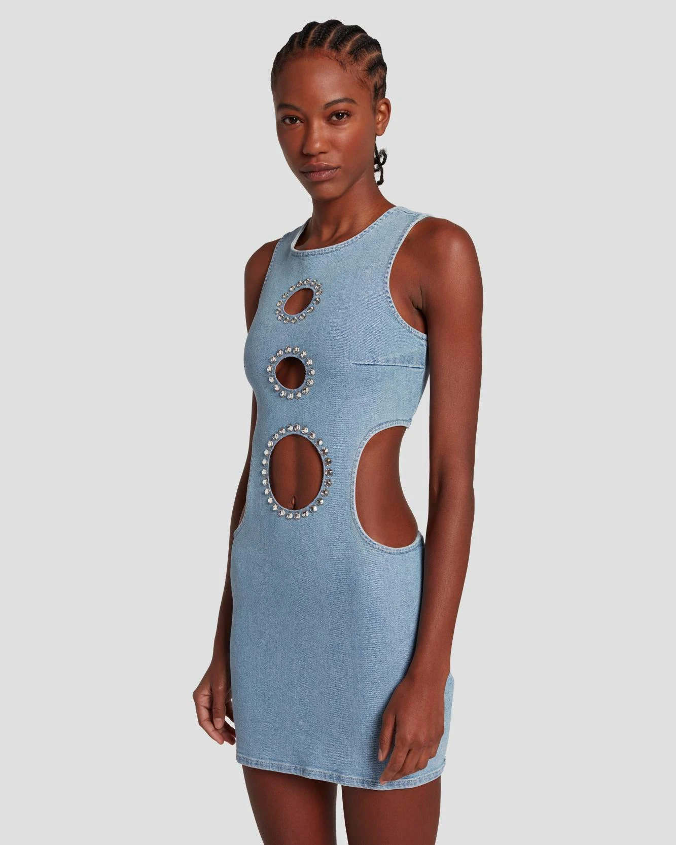 We teamed up with our favorite Fashion Editor Anna Della Russo to design this exclusive collab that celebrates high-octane glamour. This limited-edition racerback mini-dress makes a statement with its cutout design embellished with beautiful Swarovski crystals. Designed in luxe stretch denim, it features cutout back with a easy to wear zipper closure. Pair this denim dress with sparkly heels to bring a haute couture edge to this look!