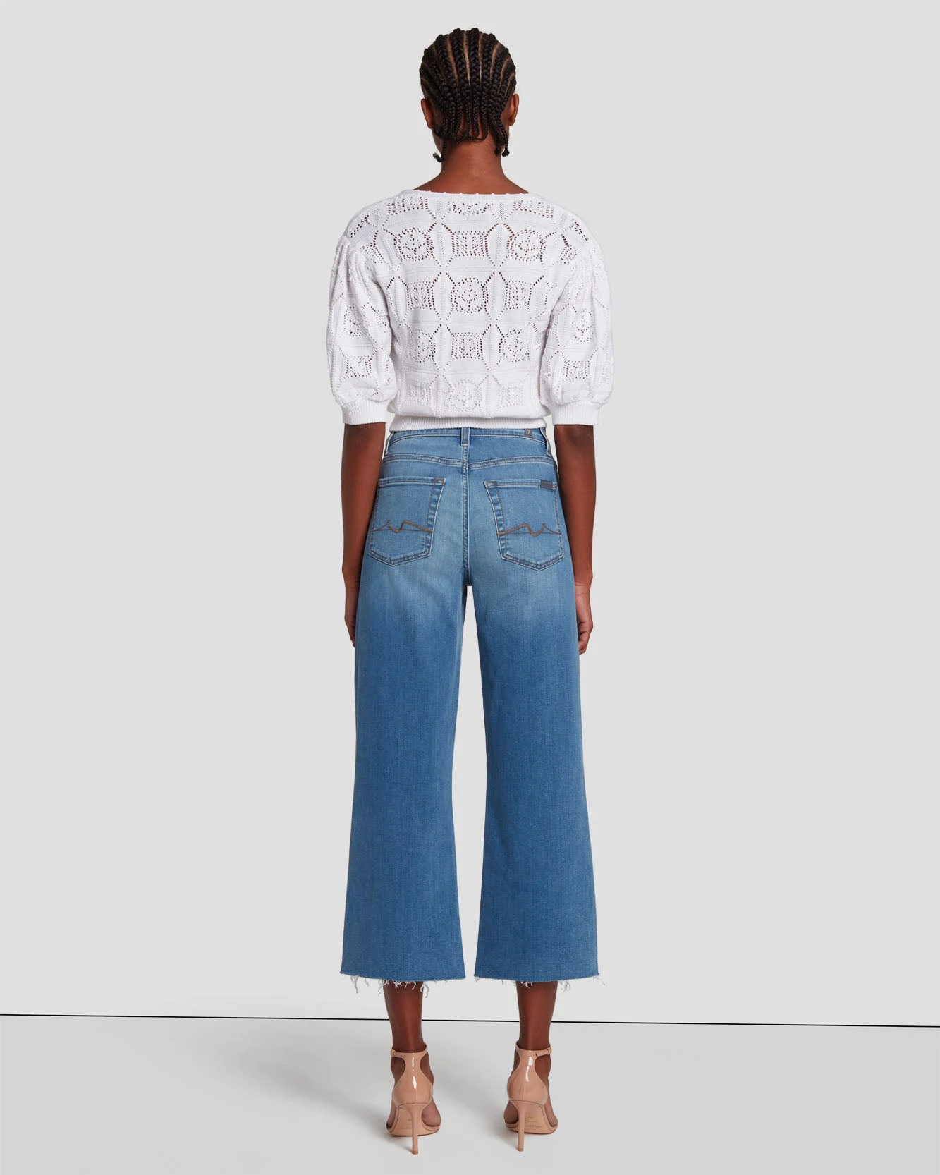 Our cropped wide-leg jeans are crafted from signature premium denim with comfort stretch for all-day wear. A bright, sapphire blue wash is marked by vintage-inspired fading and a raw hem for an effortless look. Dress up this pair of classic jeans with a puff-sleeve top or style with your favorite tee.
