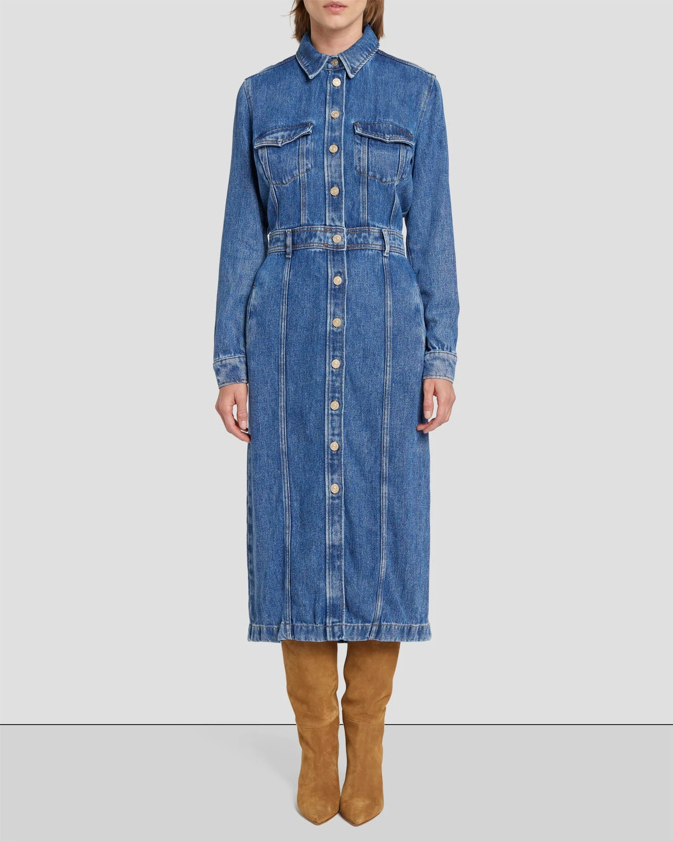 Soft as silk, light as air. Crafted from 100% lyocell, our Denim Lustre line has a super-soft hand feel and is made with the environment in mind. This Luxe Dress falls mid-calf and features a cinched waist and a shank button cuff. Wear this women’s denim dress slightly unbuttoned at the hem for an adjustable front slit, or pair it with your favorite pair of 7s for full denim dressing.