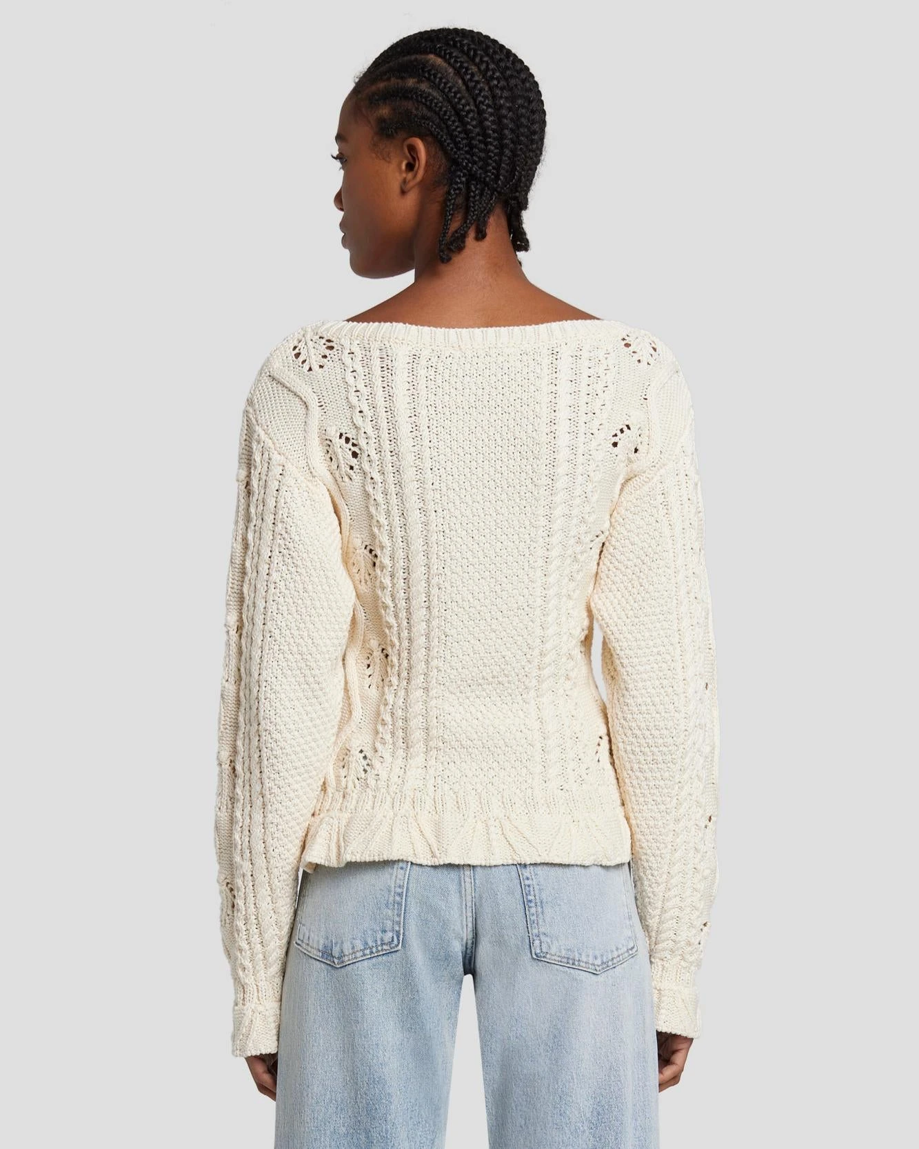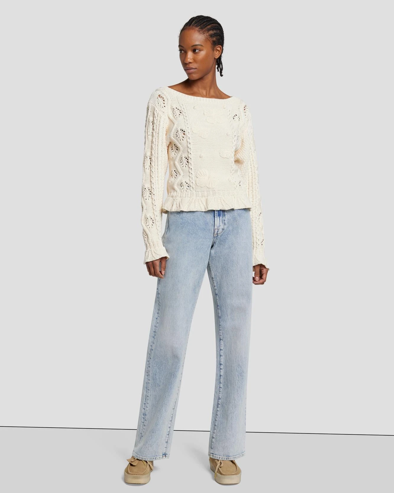 Luxe textures. This knitted crewneck sweater adds a cozy vibe to all your looks with its relaxed boat neck, delicate floral detailing and subtle peplum hem. We love to pair this wearable cream shade with our favorite dark wash denim.