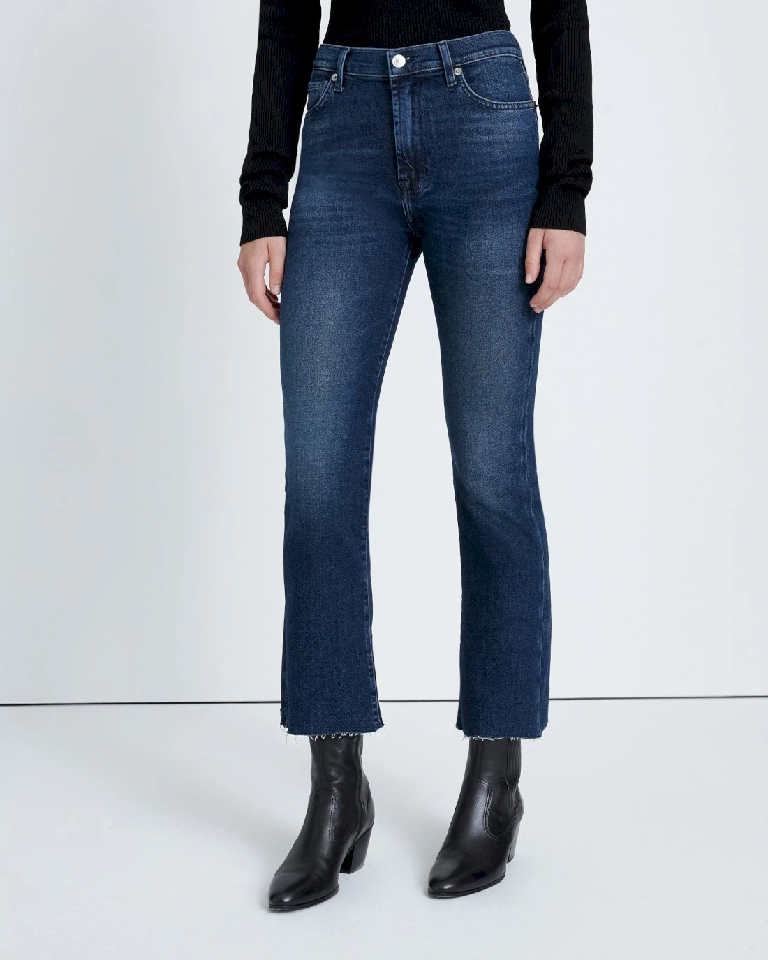With its flattering cropped kick flare, meet our well-loved High Waist Slim Kick silhouette in a moody, dark blue wash with whiskering, fading, and a raw hem. Made from our signature Luxe Vintage, a comfort stretch denim with a vintage aesthetic. Perfect for showing off strappy heels or sleek boots.