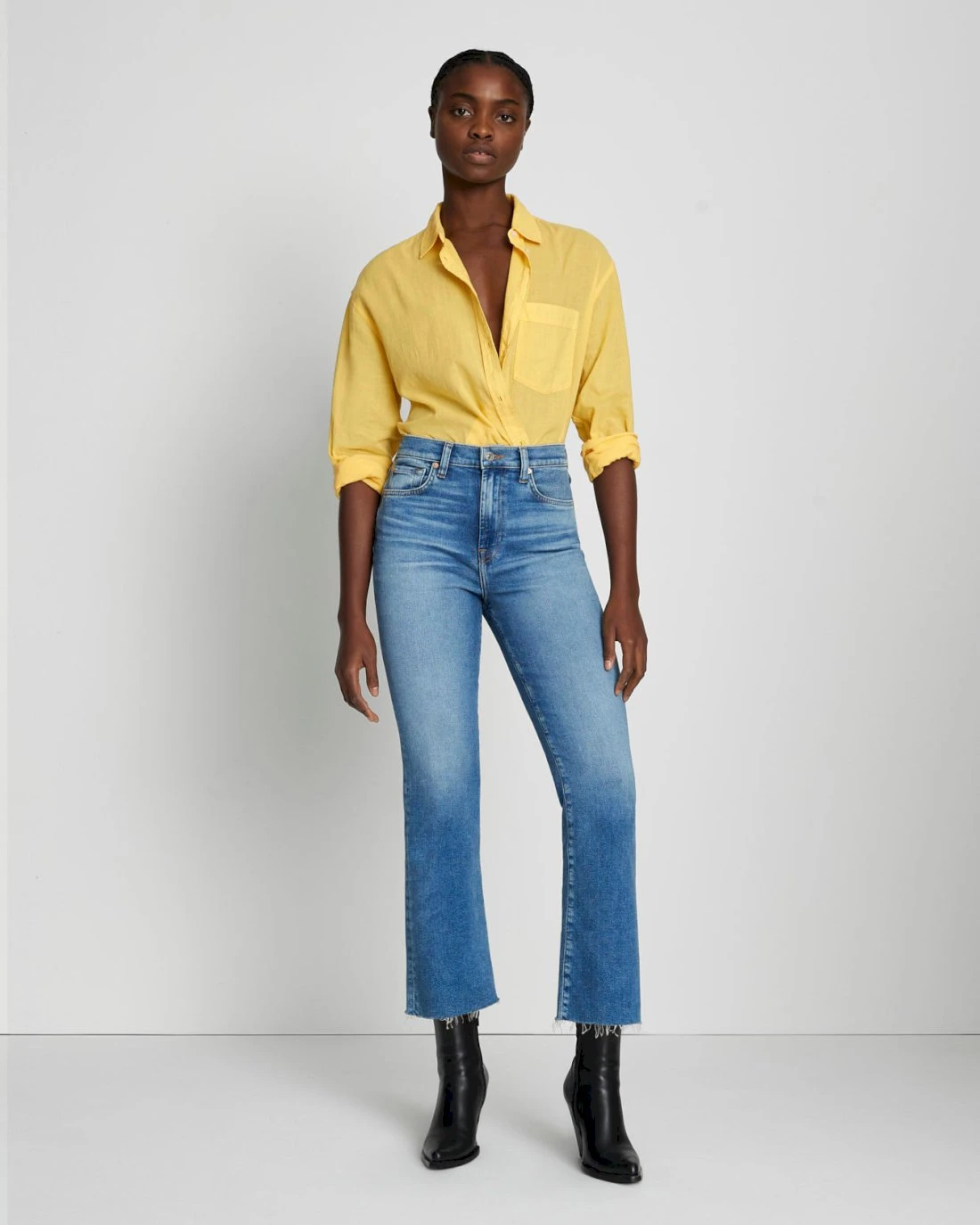 With its flattering cropped kick flare, meet our well-loved High Waist Slim Kick silhouette in a medium indigo wash with whiskering, fading, and a raw hem. Made from our signature Luxe Vintage, comfortable stretch denim with a vintage aesthetic. Perfect for showing off strappy heels or sleek boots.