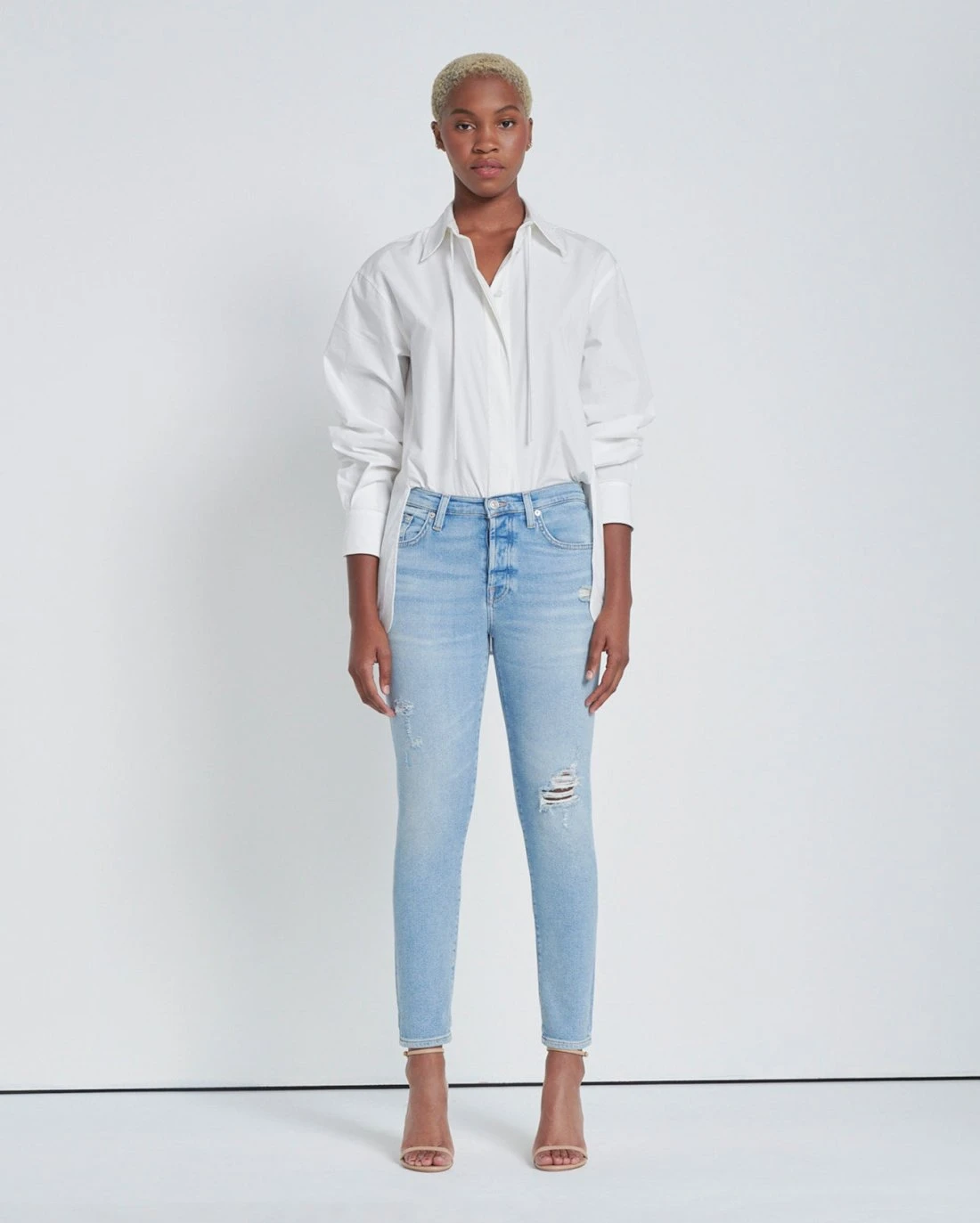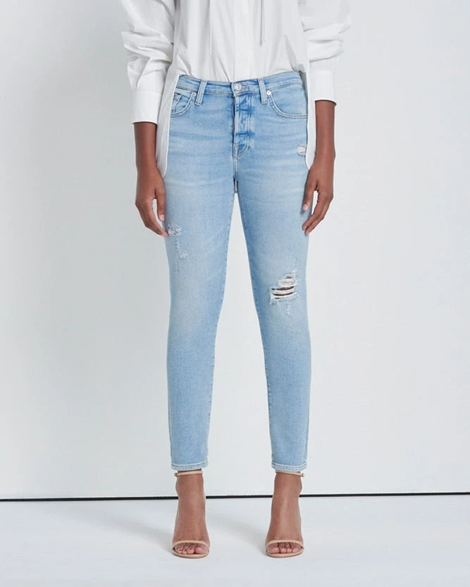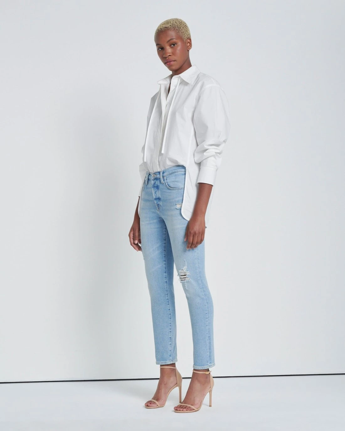 Our beloved boyfriend jean with a slimmed down silhouette gets warm-weather ready in a faded blue wash with well-placed destruction. Crafted from our signature Luxe Vintage denim, which combines a vintage look and the perfect amount of stretch, this wear-all-day pair is perfect with a tee and sneakers.