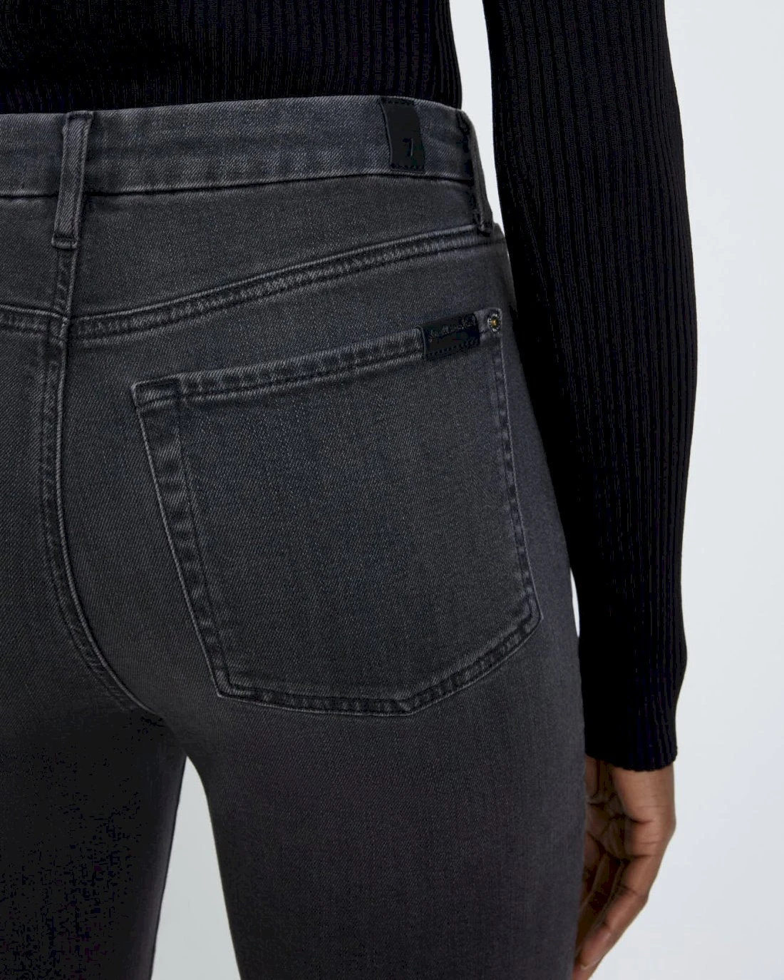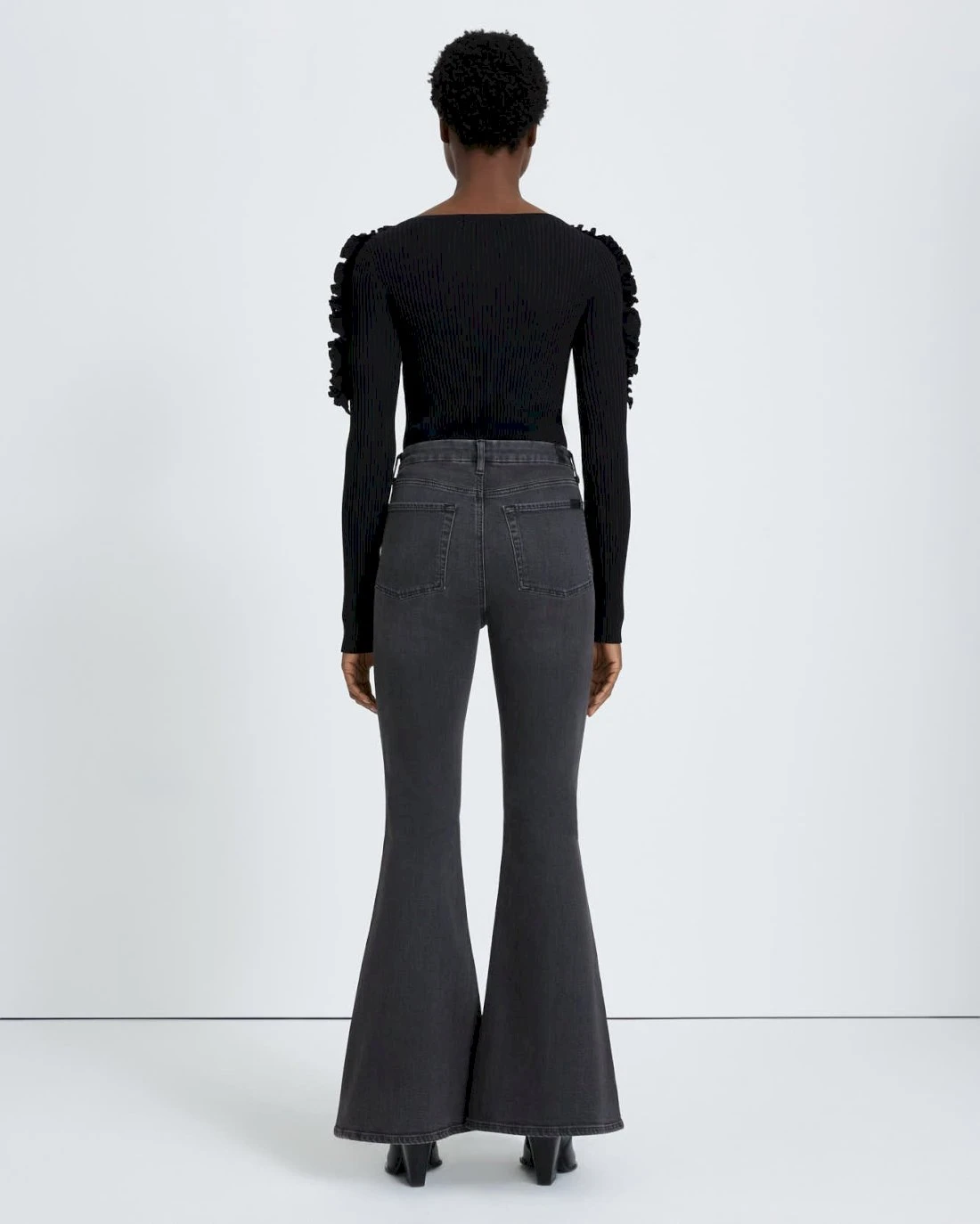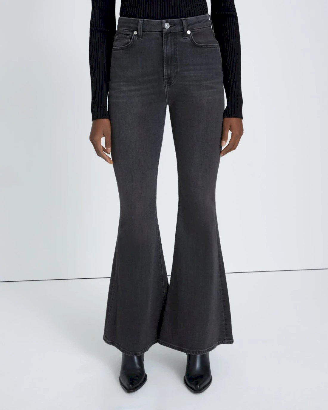 Our ultra high-rise mega flare jean is party-ready. With a 70s-inspired silhouette and medium stretch fabrication, this showstopper is done in an elevated black wash with whiskering. Fitted through the hips and thighs, its elongating leg leads to a bold flare.