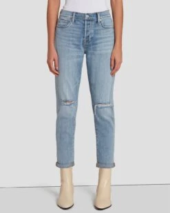 Our best-selling original bootcut reinvented. Done in a dark wash with light whiskering and cut from medium stretch denim for all-day comfort. Its low-rise silhouette is finished with an unexpected ripped knee for a worn-in look.