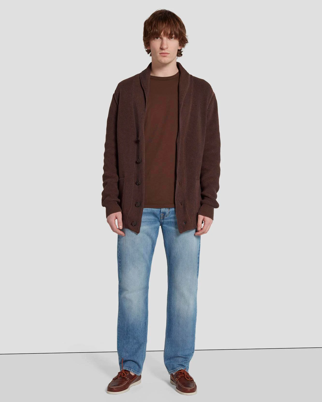 This rich brown cardigan was crafted in Italy with a variety of different yarns for a one-of-a-kind, textrured effect. Featuring ribbed detailing and two front pockets, this piece looks great layered over a tee and your favorite pair of denim.