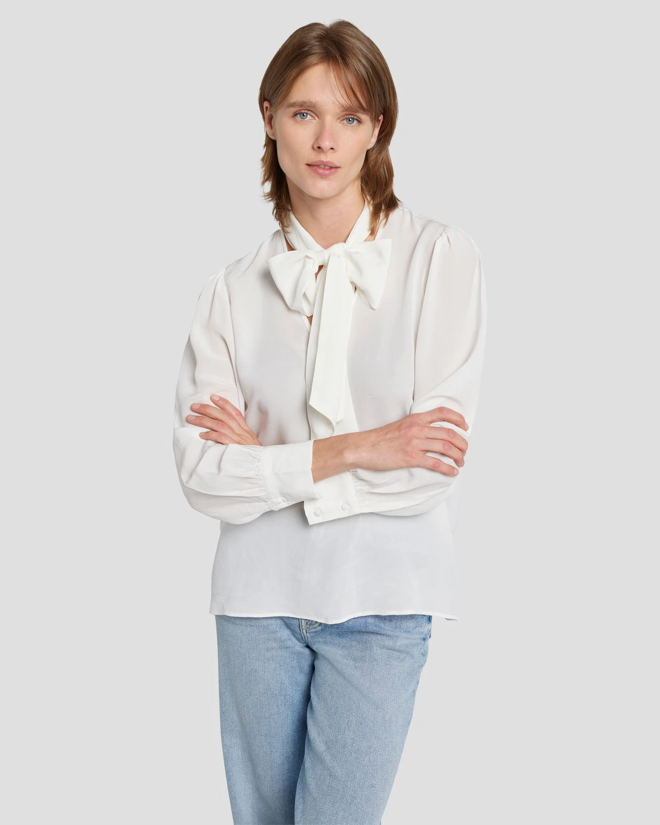 Dress her up. Dress her down. Crafted from 100% silk, this top of the moment makes an impression with flowy blouson sleeves and a statement pussy bow. Wear her tied up for a more ready-to-wear look. Loosen her up and pair with a vest for casual elegance.