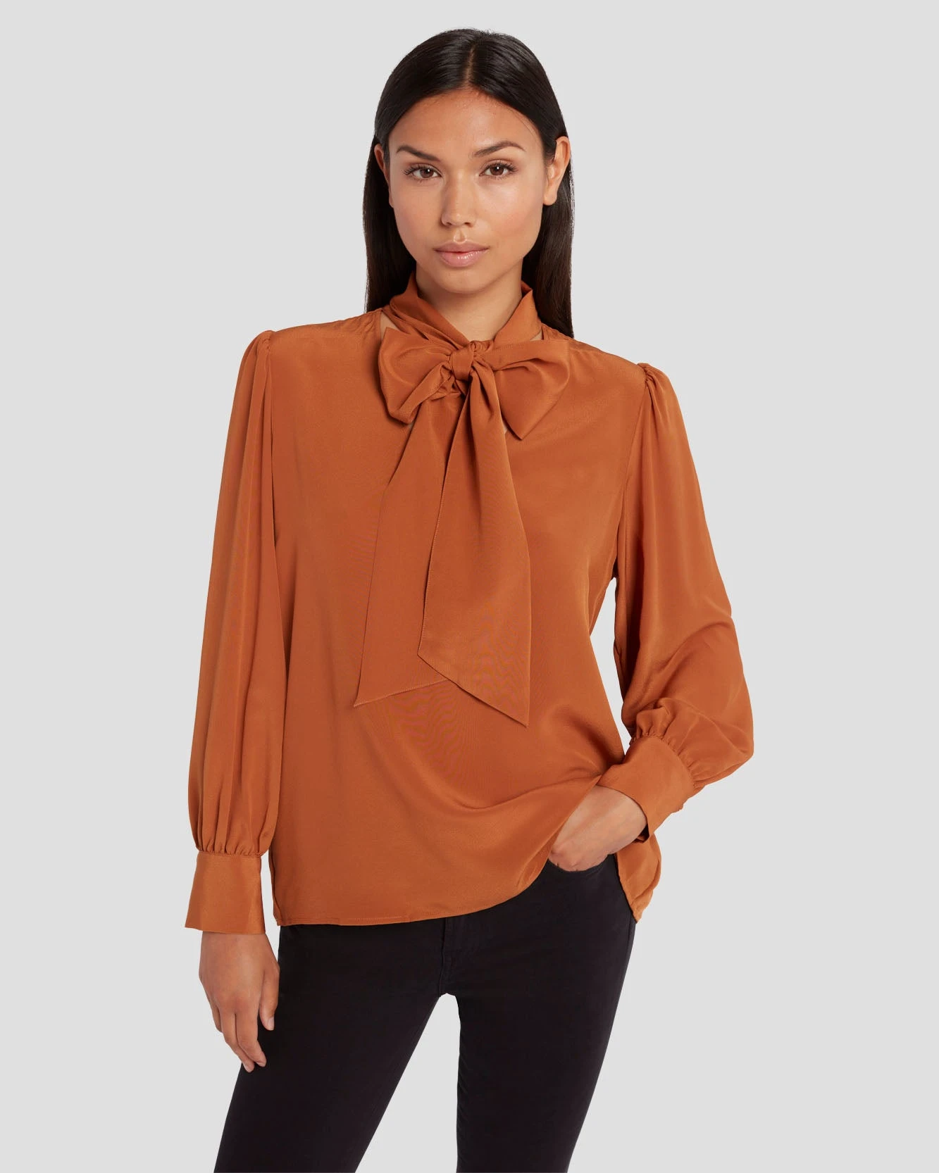 7 For All Mankind Silk Tie Neck Blouse In Ginger