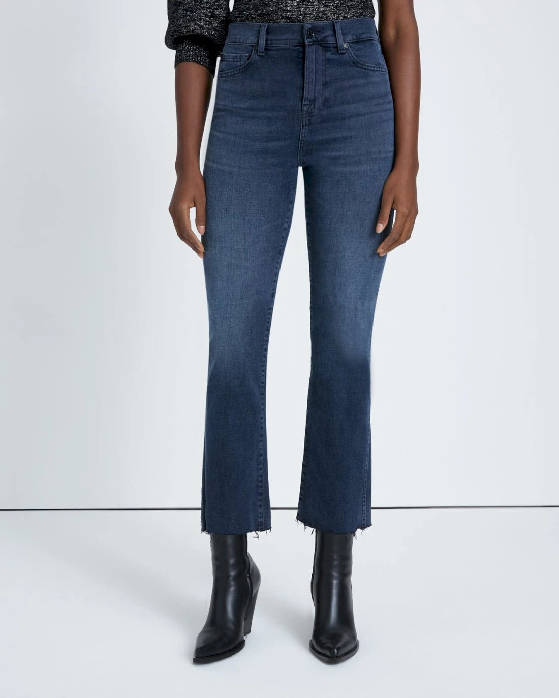 This high waist, slim fit jean with a cropped, kick flare is updated in our latest innovation Slim Illusion Earthkind denim. Crafted partially from organic yarns with less impact on the environment, this fabric features stretch cotton engineered to move with you, maintain shape, and flatter every figure. Offered in a faded dark wash and punctuated with a frayed hem you’ll pair them with everything in your wardrobe.