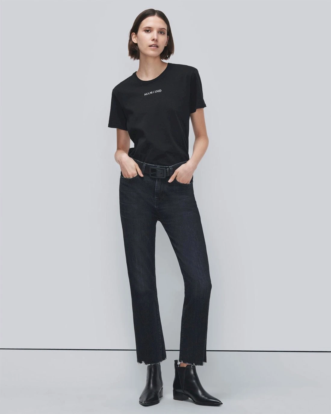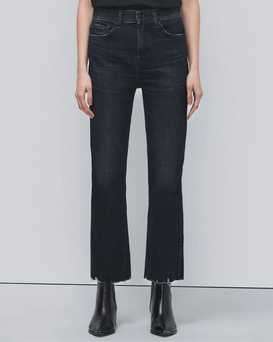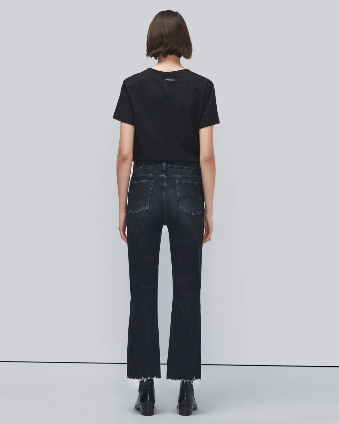 This high waist, slim fit jean with a cropped, kick flare hem is updated in our latest Slim Illusion Earthkind denim. Crafted partially from organic yarns with less impact on the environment, this fabric features stretch-cotton engineered to move with you, maintain shape, and flatter every figure. Offered in a washed black and punctuated with a frayed, worn out hem. Pair for polish with a fluid blouse or keep it casual with an oversized knit.