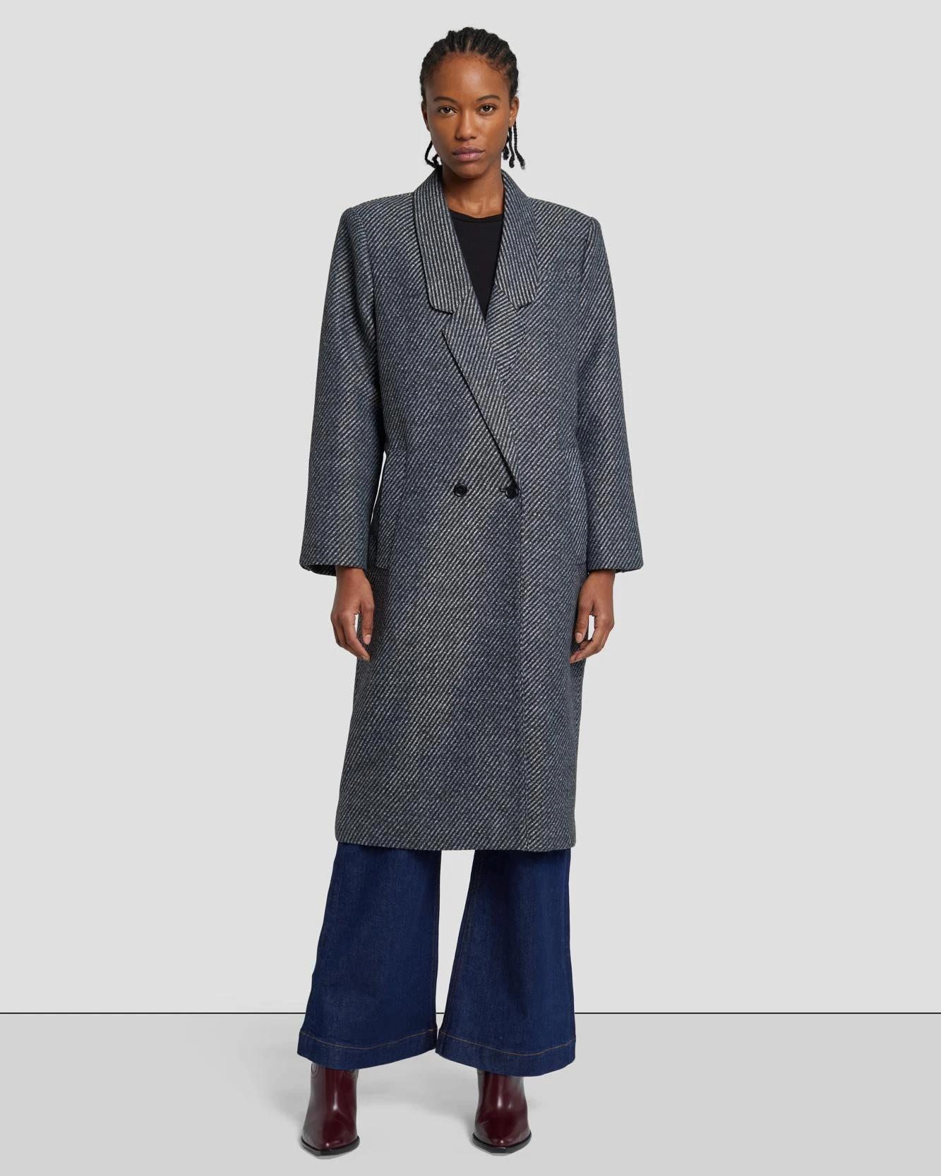 Layer up. This oversized coat features functional front pockets and pronounced shoulder pads. The perfect piece to bundle up in this fall.